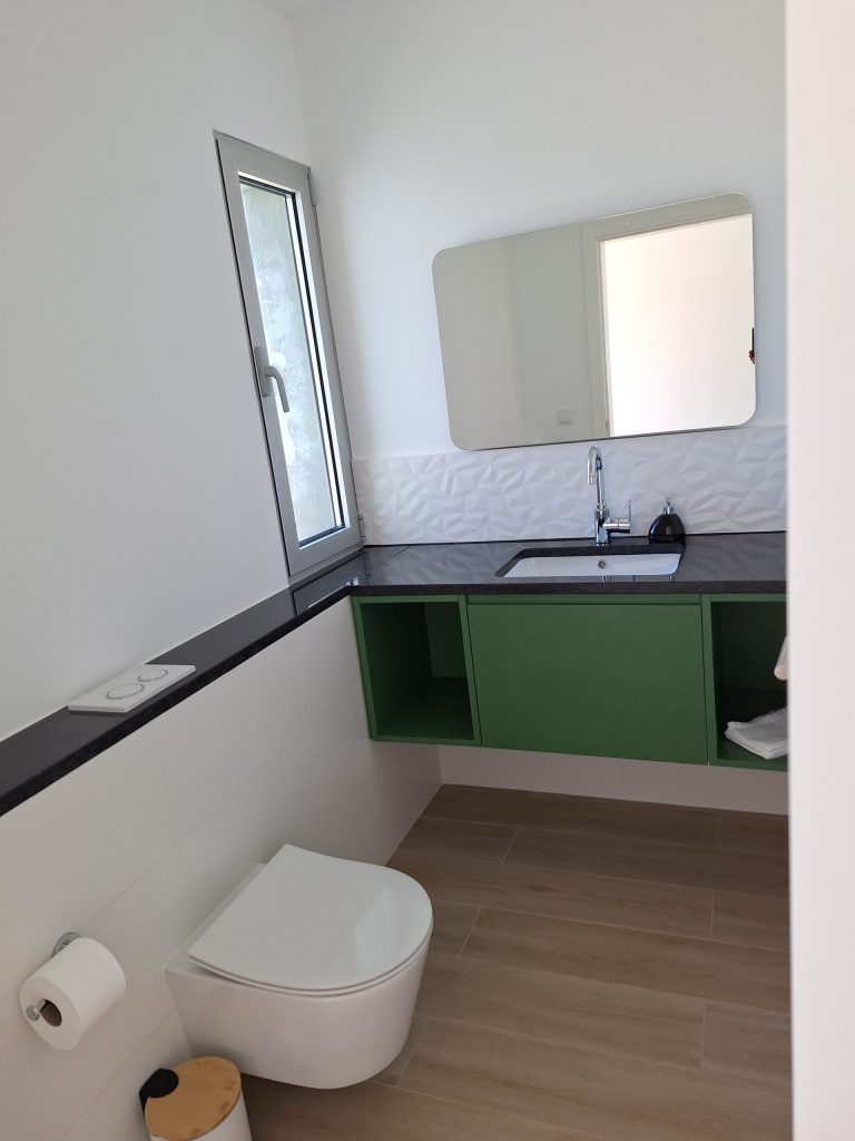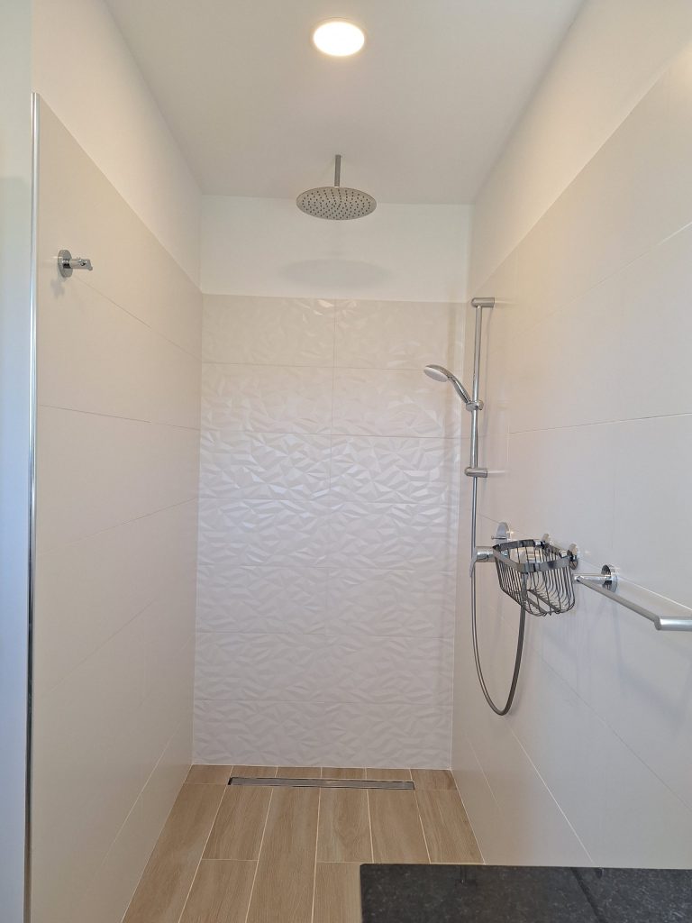 The bathroom has a large walk-in shower with rainshower. There is also a separate second toilet. The French waffle piquee towels are of course eco-quality.